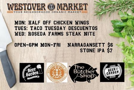 Westover Beer Garden is committed to using Local, Fresh, Organic Produce, Meats & Ingredients in a fun atmosphere welcoming to all walks of Life with a Great, Rotating Beer Selection.